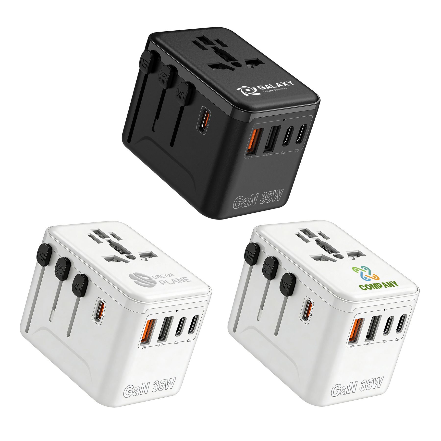 Get your custom 35W GaN Universal Travel Adapter (3C2A) to make your logo stand out when in use! Made from durable PC material for long-lasting use. You can choose from screen print, laser engraving or digital UV print to showcase your logo or design. With safety lock controls, the plug slides out safely and easily. Two USB-A and three USB-C ports come with each adapter, and they can be used separately. Compatible with AUS, US, UK, and EU outlets, universal in Asia. Perfect for travel, business trips, home or office. Charge fast and reliably with this compact GaN adapter—boost your brand as a practical promotional gift for clients or employees!